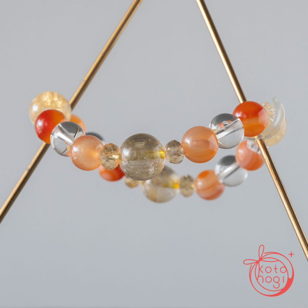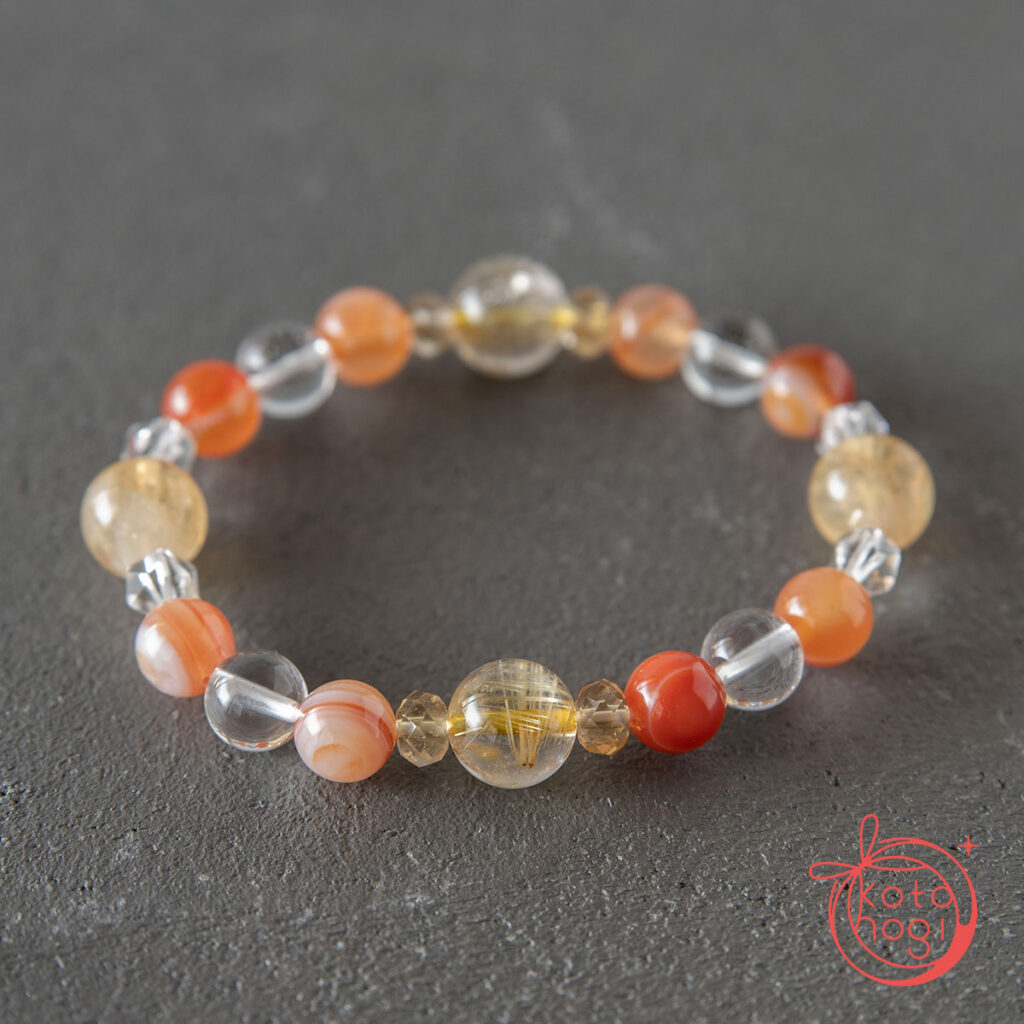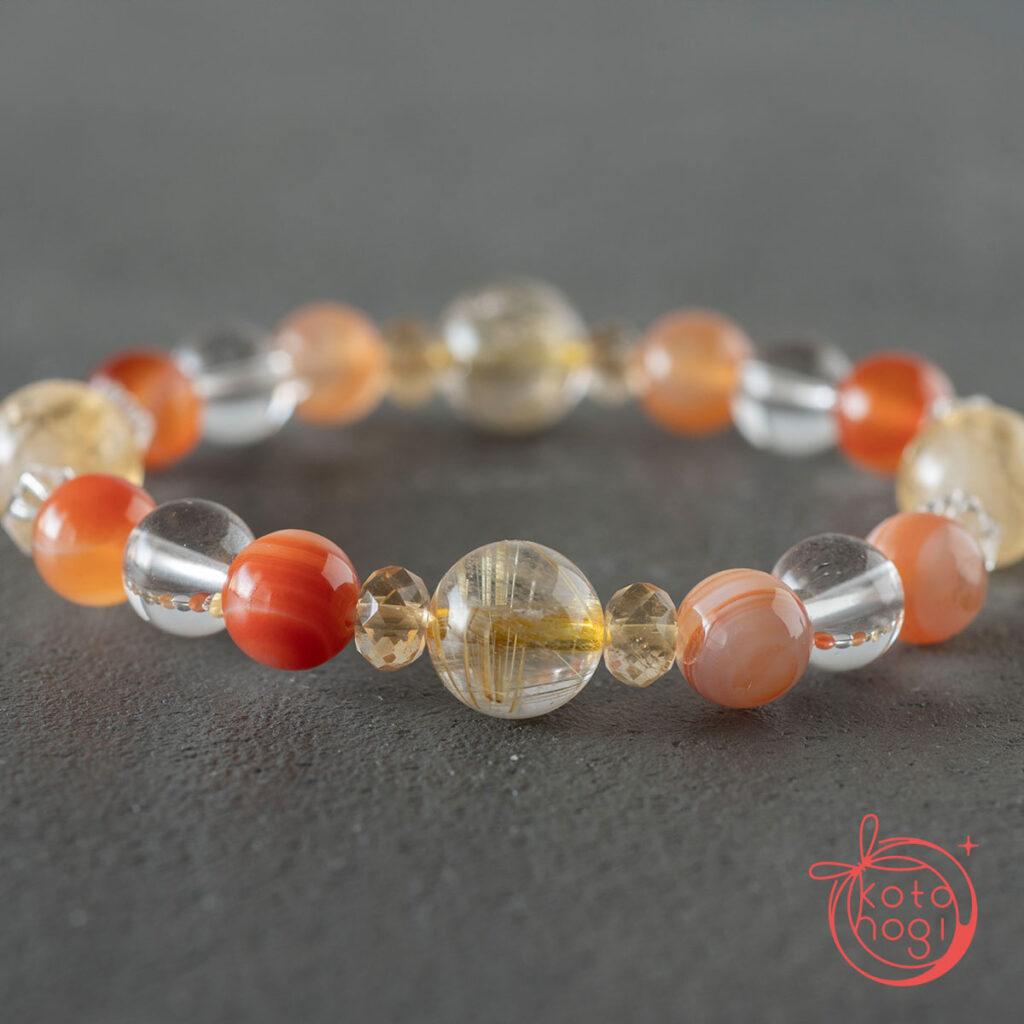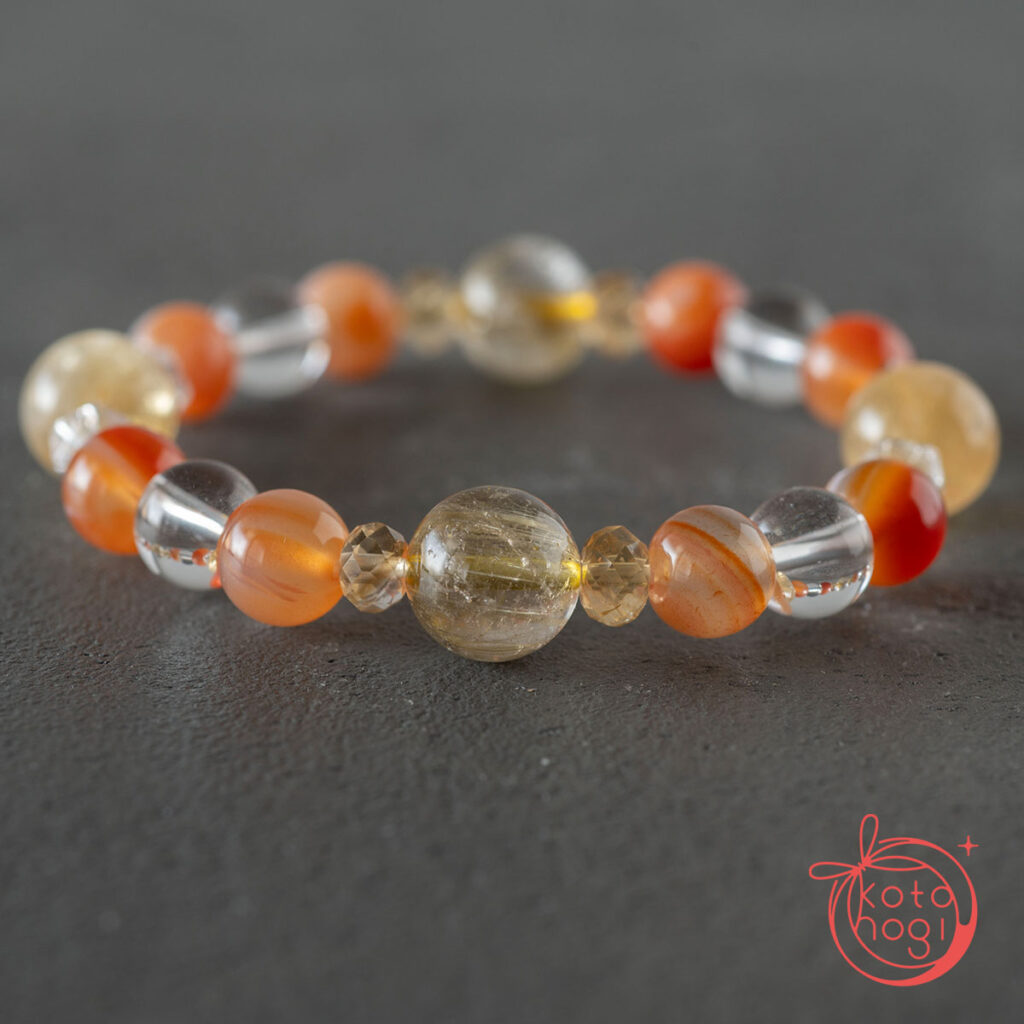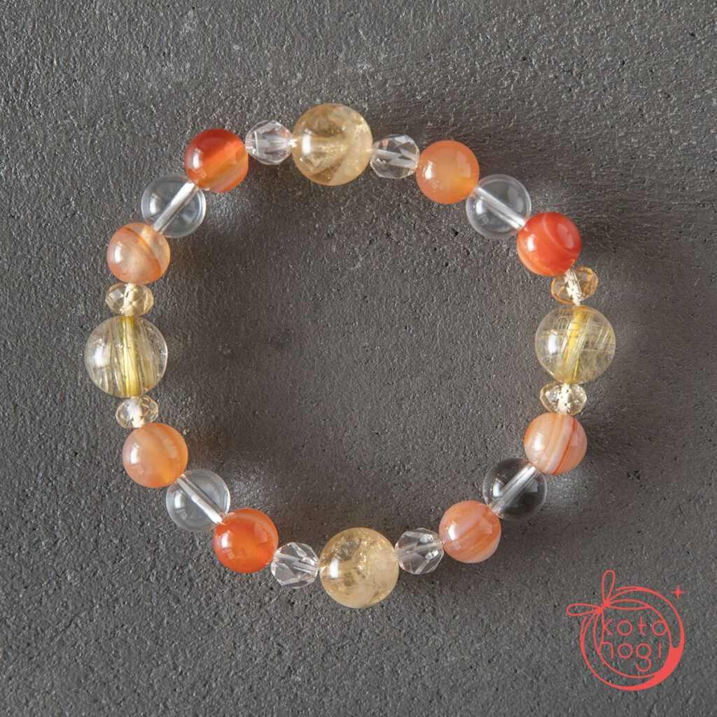 黄金の光を宿すゴールドルチルクォーツを中心に、 繁栄の象徴であるファントムシトリンを重ね、 金運・仕事運・商売繁盛を祈念して仕立てたブレスレットです。