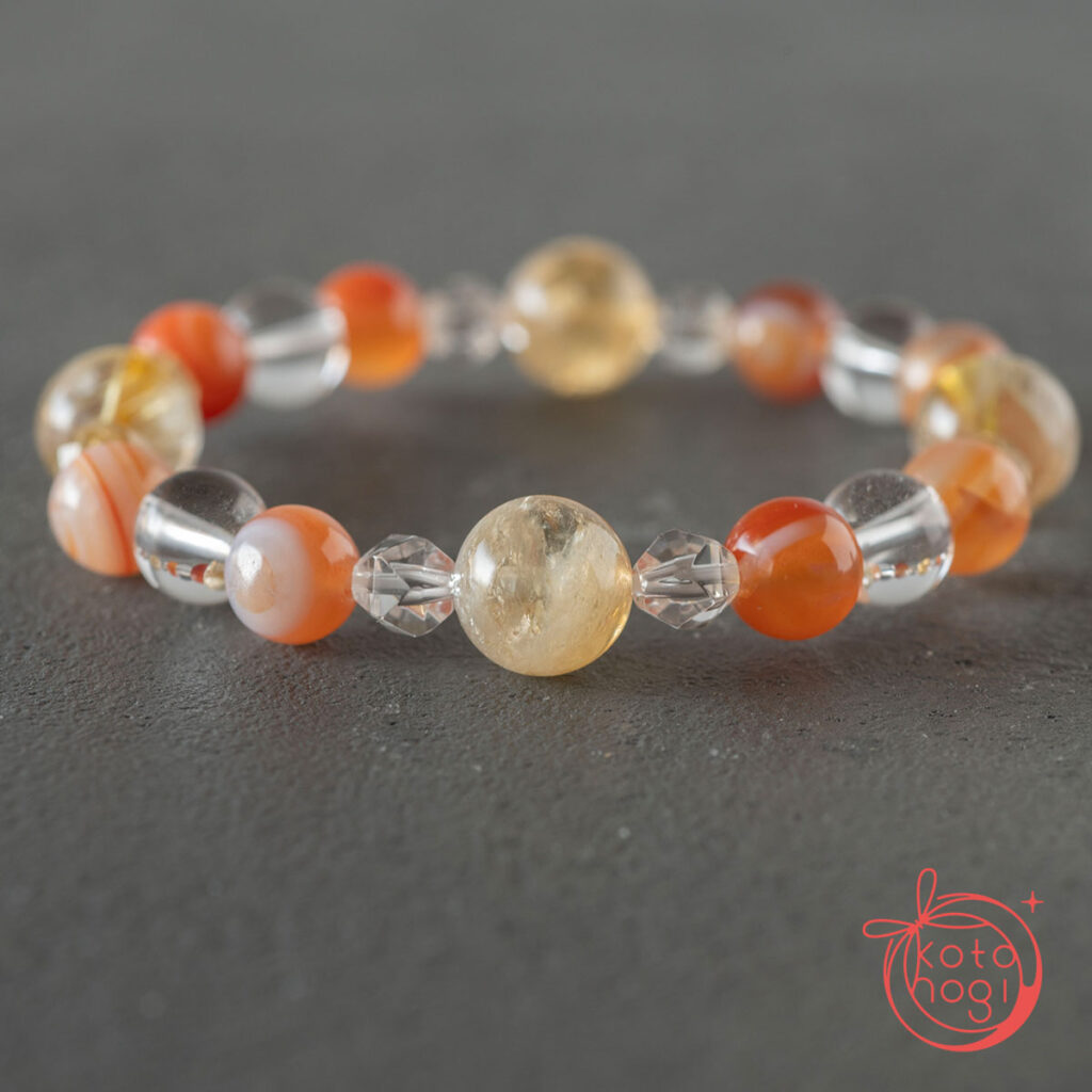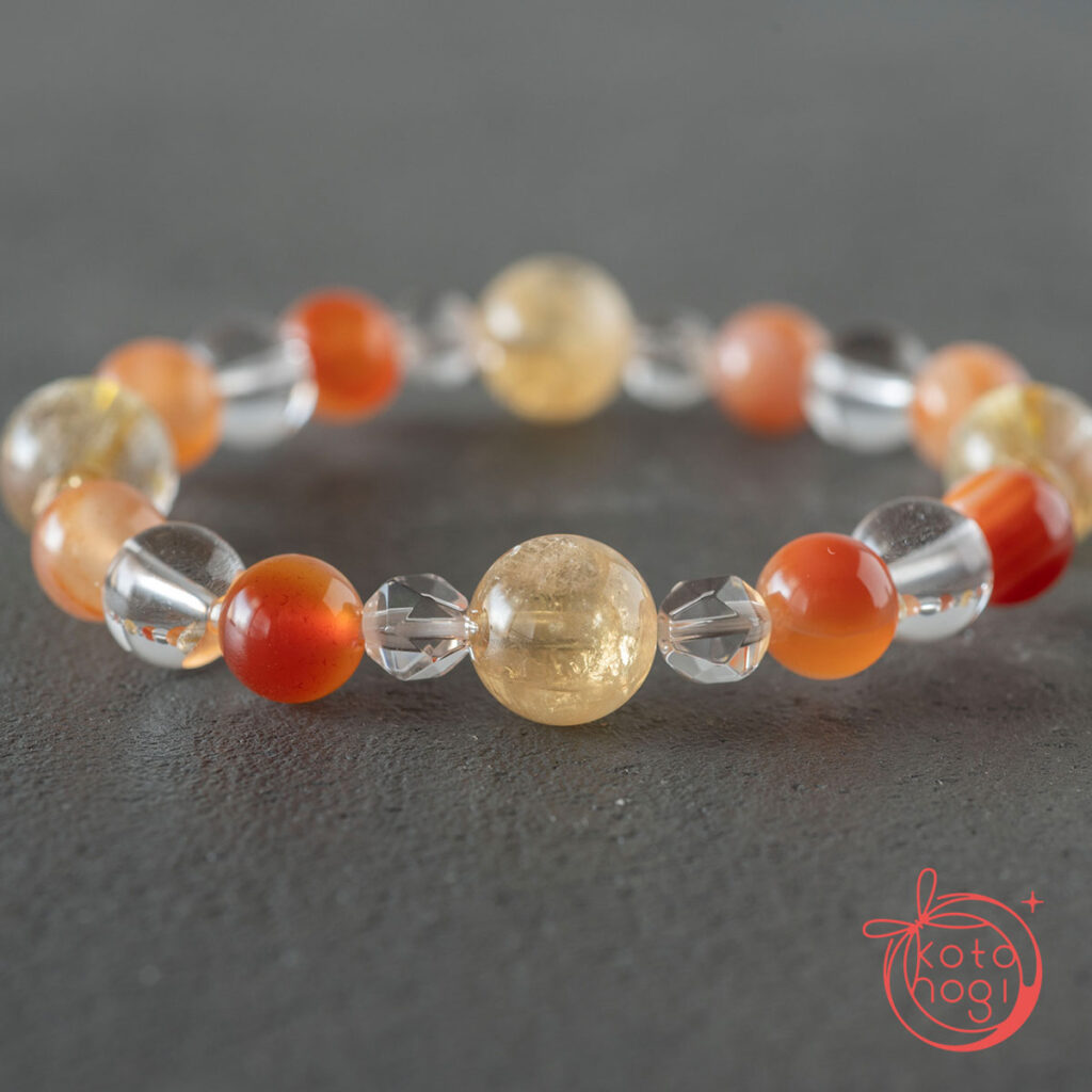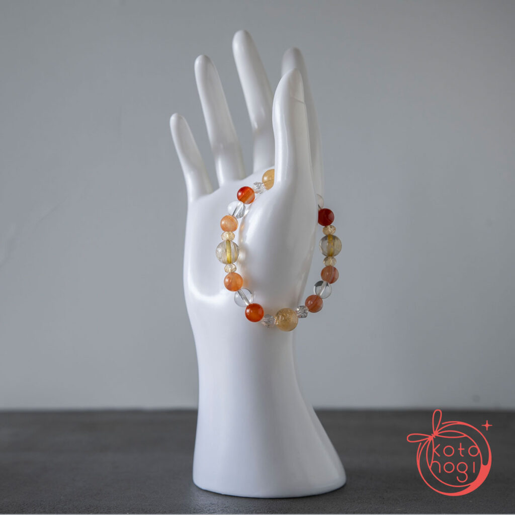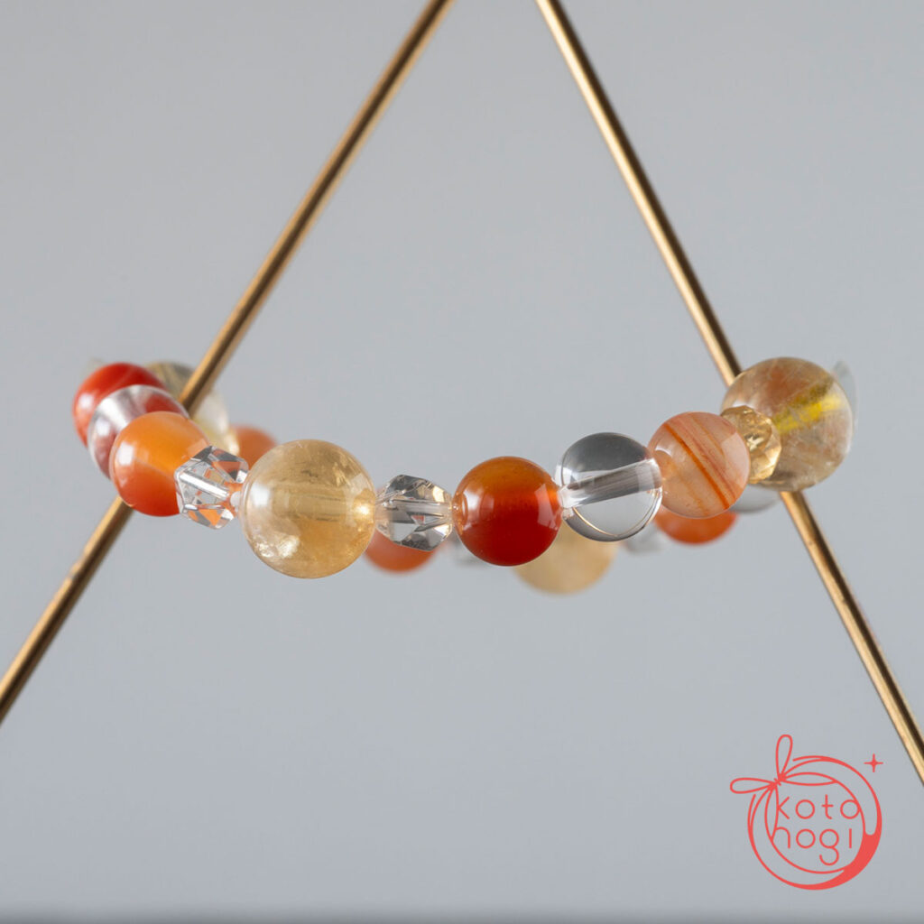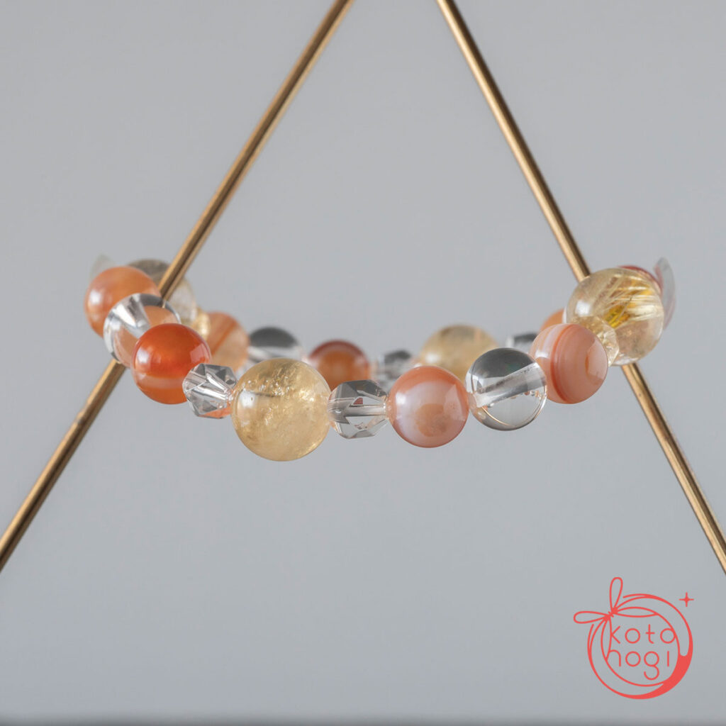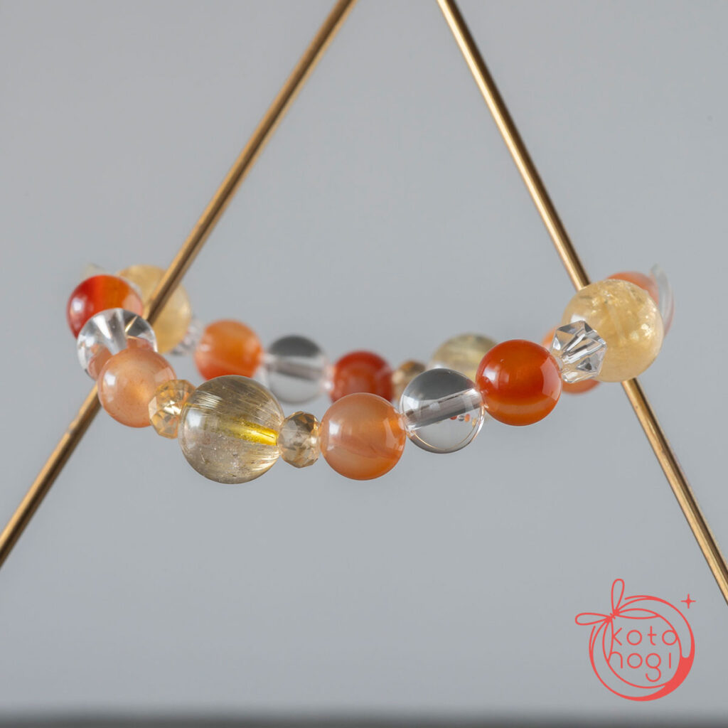 黄金の光を宿すゴールドルチルクォーツを中心に、 繁栄の象徴であるファントムシトリンを重ね、 金運・仕事運・商売繁盛を祈念して仕立てたブレスレットです。