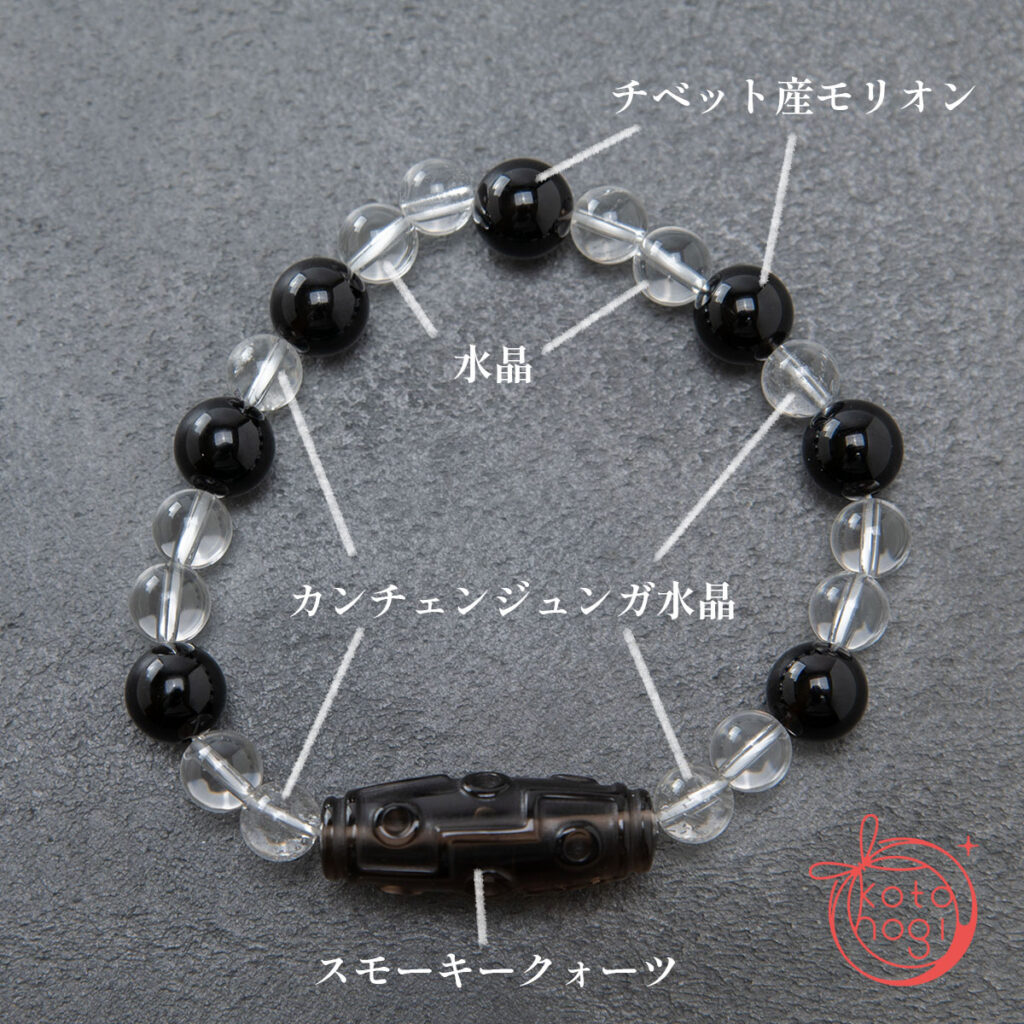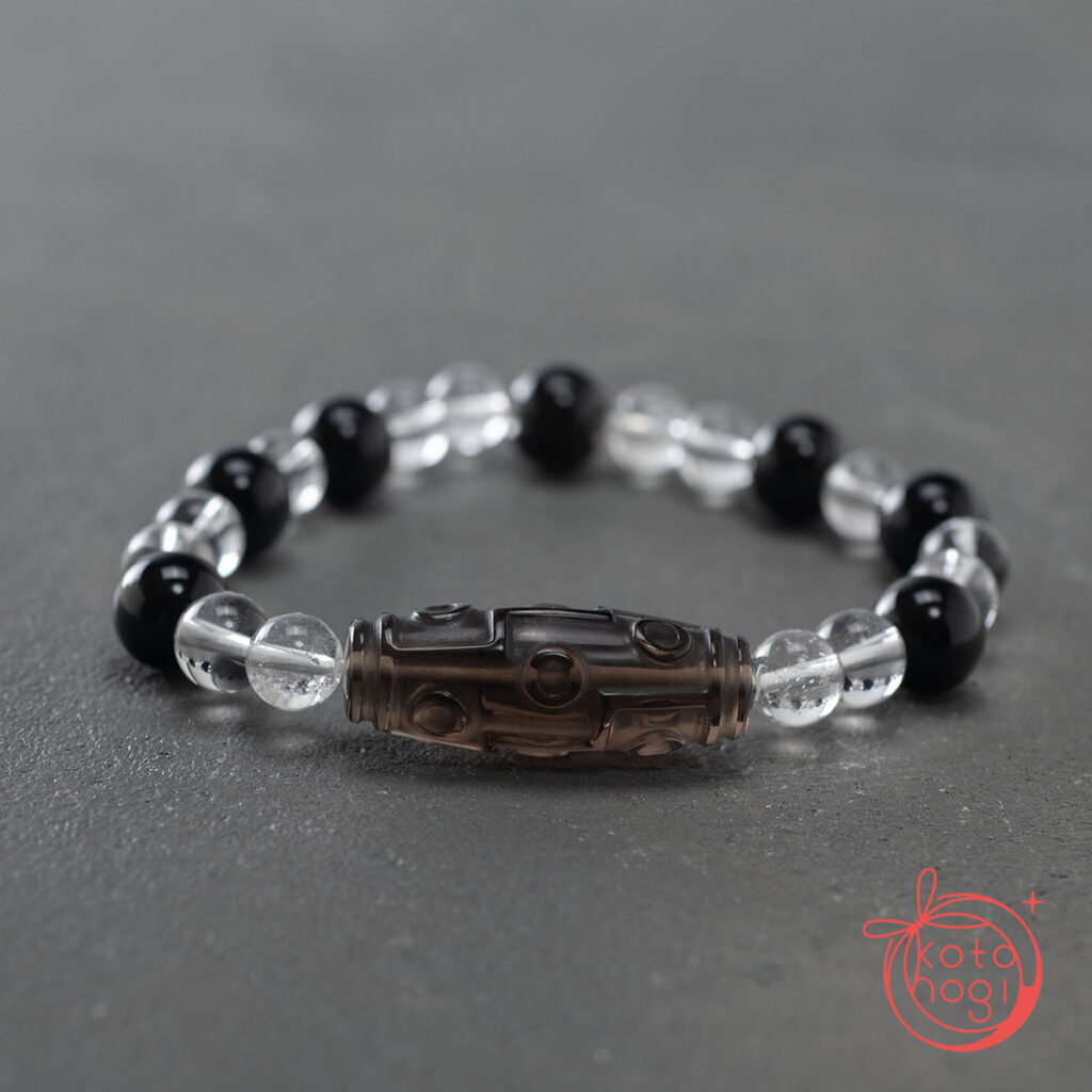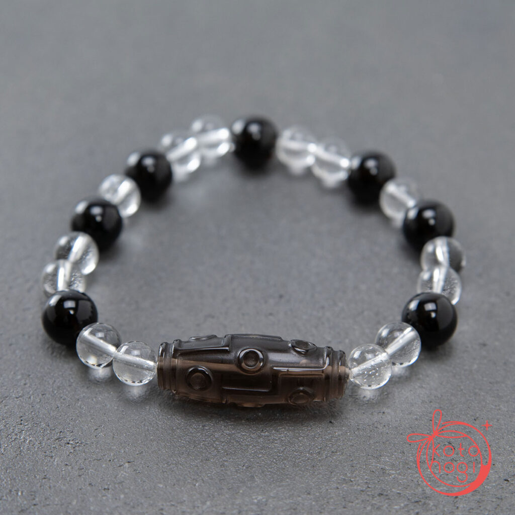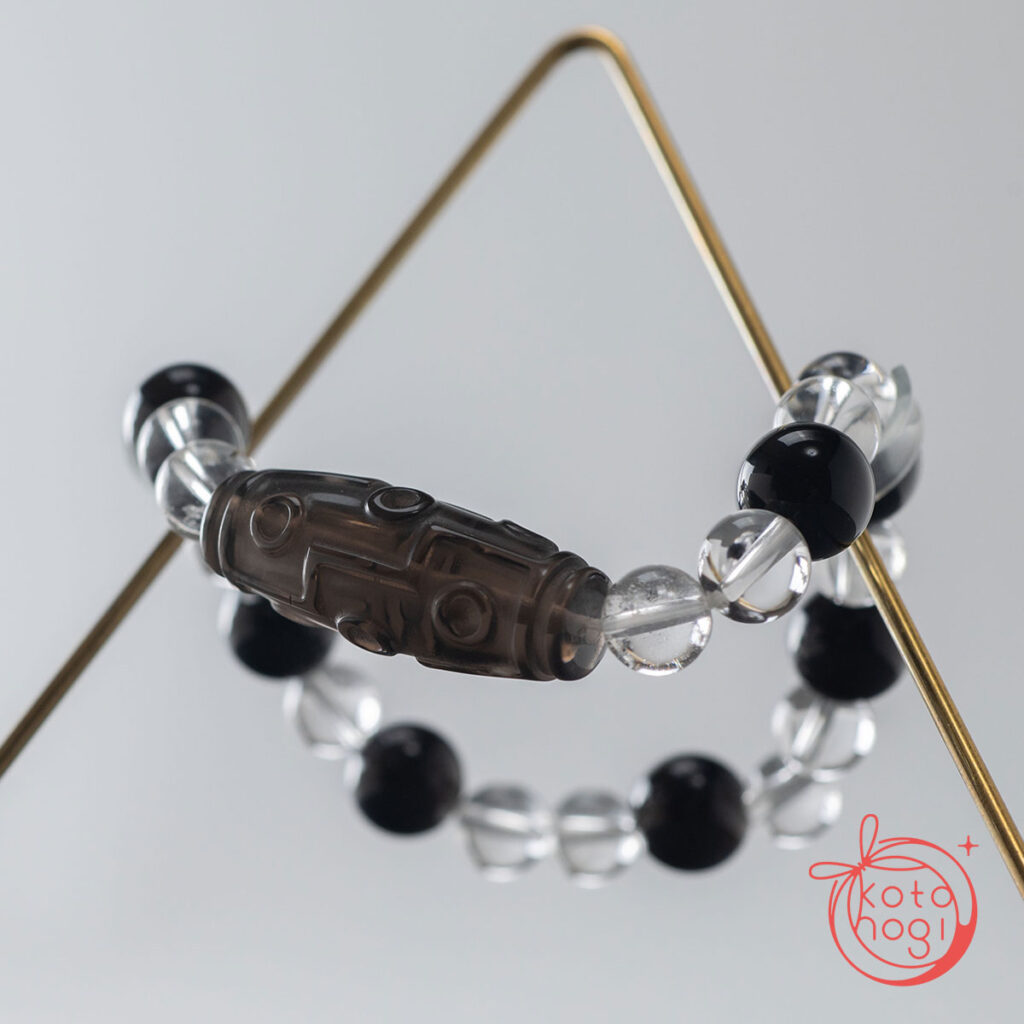 厄を祓い、停滞を抜けて流れを整えるために組み上げた一本。 スモーキークォーツの九眼天珠を中心に、チベット産モリオンとヒマラヤ水晶を合わせました。逆境をしなやかに乗り越え、状況を好転へ導く守りのブレスレットです。