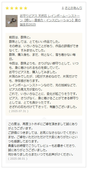 ピアス、さりげなく、身に着けることができる御守りとしては、とても良かったです。【お客様の声】