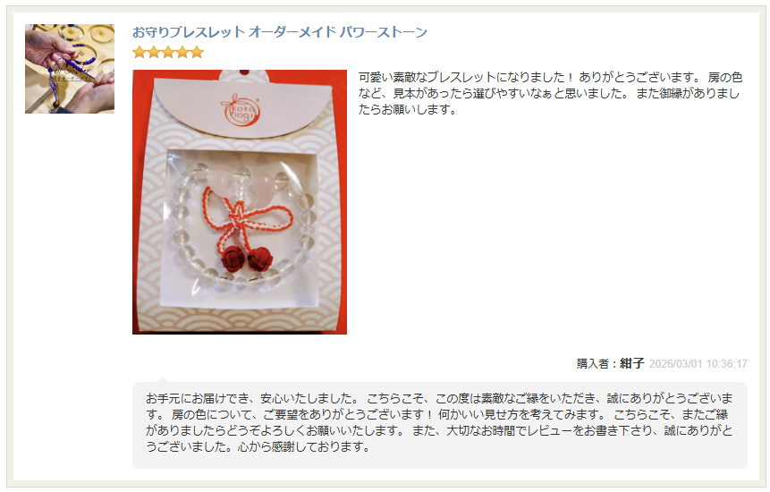 お手元にお届けでき、安心いたしました。 こちらこそ、この度は素敵なご縁をいただき、誠にありがとうございます。 房の色について、ご要望をありがとうございます! 何かいい見せ方を考えてみます。 こちらこそ、またご縁がありましたらどうぞよろしくお願いいたします。 また、大切なお時間でレビューをお書き下さり、誠にありがとうございました。心から感謝しております。