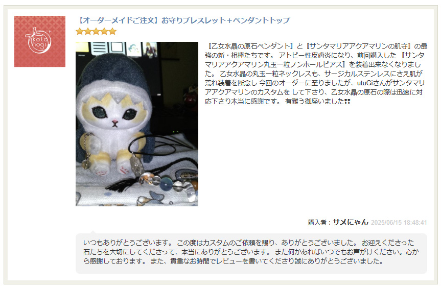 いつもありがとうございます。 この度はカスタムのご依頼を賜り、ありがとうございました。 お迎えくださった石たちを大切にしてくださって、本当にありがとうございます。 また何かあればいつでもお声がけください。心から感謝しております。 また、貴重なお時間でレビューを書いてくださり誠にありがとうございました。